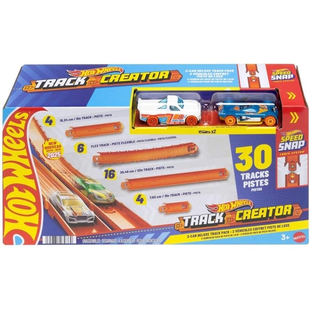 Design and create original track builds or enhance existing ones with the Hot Wheels Track Creator Deluxe Track Pack. This variety pack contains 25 feet of Speed Snap Track, including different lengths of molded straight and flex track and connectors to link them together. The two adapters make the Speed Snap Track compatible with legacy Hot Wheels e-track kids can add them to playsets and track sets to build out their Hot Wheels worlds. Additional tracks and sets sold separately. The two Hot Wheels cars are ready to race right out of the box. Colors and decorations may vary.