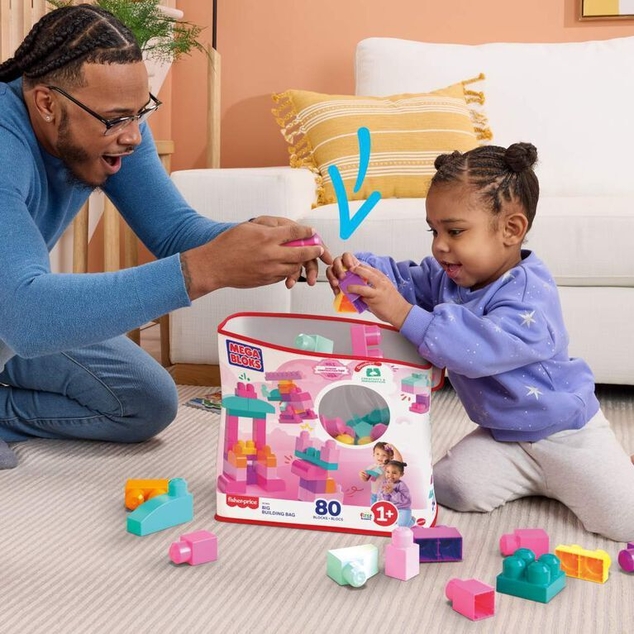 Spark your little builder’s imagination with the Big Building Bag, filled with big and colorful blocks. The perfect fit for little hands and big imaginations, these blocks are easy to grip and easy to stack, helping to develop fine motor skills, creativity and imagination. When playtime is over, store the blocks in the reusable bag for easy cleanup. Best of all, the Big Building Bag combines with all MEGA BLOKS building sets to expand playtime for hours on end.