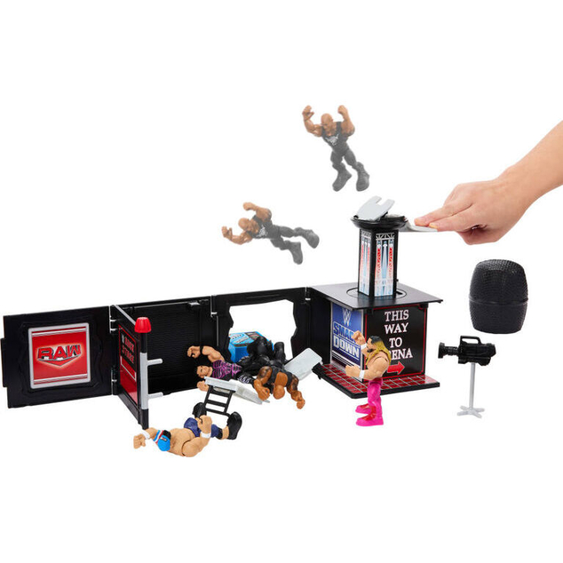 Launch the Knuckle Crunchers The Rock figure and smash through the walls backstage!