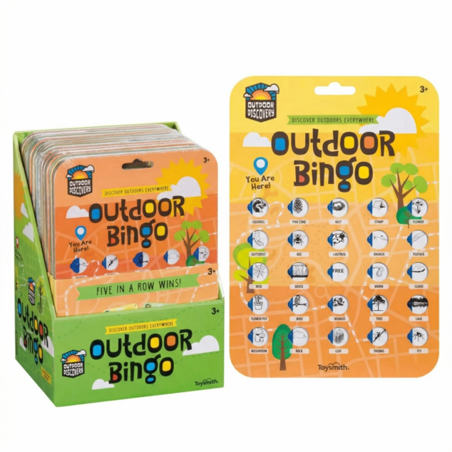 From Outdoor Discovery comes a pack of 4 reusable outdoor bingo cards. Each card holds 24 unique slots with one free spot in the middle. Just slide the windows closed to mark a spot. Spots are themed for different animals, plants, and elements of nature, like trees, mushrooms, bats, and more. Each pack includes 4 cards in assorted colors with sliding plastic windows. An assortment of 12 4-packs come in a 7.09 x 5.7-inch bright green display case.