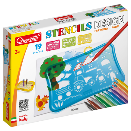 Discover the Quercetti Stencils Design Farm, a fun and durable drawing set made from unbreakable plastic with smooth, rounded edges. Its raised ridged perimeter and new tracing outlines help kids create precise drawings and vibrant coloring. The cleverly designed case matches the stencil shapes for tidy storage alongside included markers. The transparent lid doubles as an extra stencil and a versatile pen holder, standing both vertically and horizontally. Perfect for sparking creativity, this set also includes a handy drawing album to inspire young artists on their farm-themed adventures.