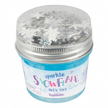 Each jar of Snowflake Mix-Ins includes slime and holographic glitter confetti shaped like sparkling snowflakes. Plastic container includes a resealable twist top. 1 container holds 5.5 ounces of icy blue, glitter slime that is nonstick. 12 Snowflake Mix Ins per case.