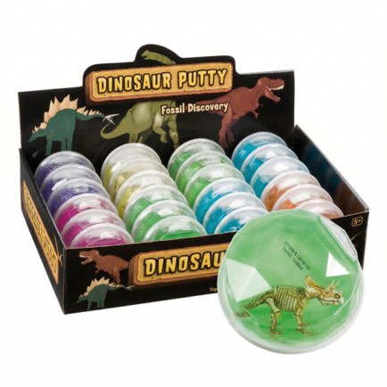 Inside this gel-like putty lies a dinosaur fossil. This Toysmith Dinosaur Fossil Discovery Putty is a favorite with kids and parents alike. Stretch it, throw it, stick it, squeeze it - hours of sensory, tactile fun that makes it a popular impulse buy, party favor and goodie bag item. Each putty comes in a reusable plastic container. Assorted fossils and colors are available.