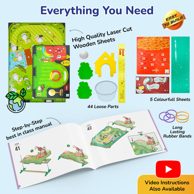 With this kit, your child will build a tabletop Mini Golf game. Aim and shoot the balls using a unique mechanical golf club. Putt the balls into the holes to collect Flag points.