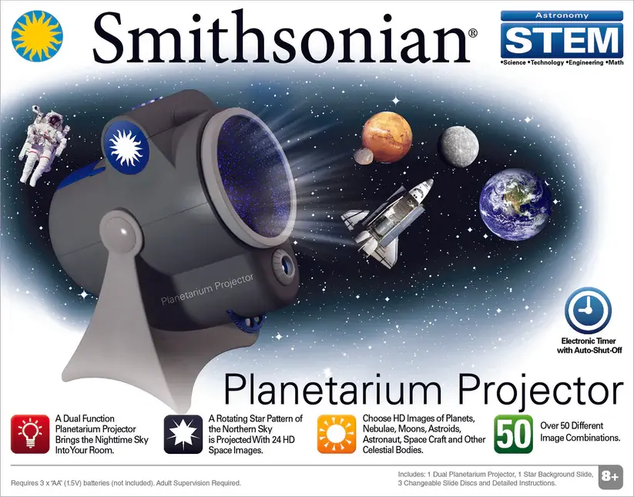Bring the wonder of the nighttime sky into your room with this dual-function planetarium projector. Aim the projector at a light-colored wall and gaze at a rotating pattern of the northern sky. Three disks feature 24 high-definition space images to project alongside the stars: planets, nebulae, moons, asteroids, and more. The Smithsonian Planetarium Projector features a 15-minute auto-shut-off, so you can fall asleep under a magical night sky. It comes with STEM educational content and requires 3 AA batteries (not included).