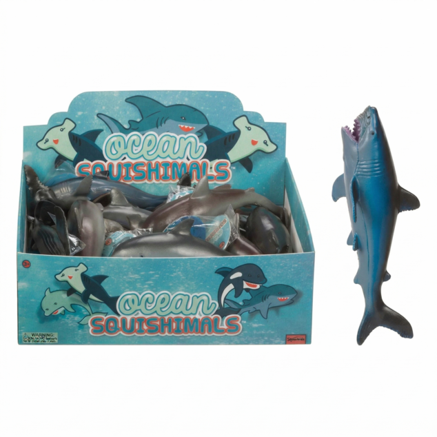 Ocean Squishimals from Toysmith are authentically designed. Choose from 4 assorted finned creatures, including 2 kinds of shark, a dolphin, and a humpback whale. Each creature varies in size from 6.3 to 7.5 inches long, and weigh from 1.76 to 1.92 ounces. All are sand-filled and feature soft, pliable skin for a wonderful stretchy and squishy tactile experience. A colorful turquoise display case with illustrated sharks, dolphins, and whales holds 18 ocean squish toys.