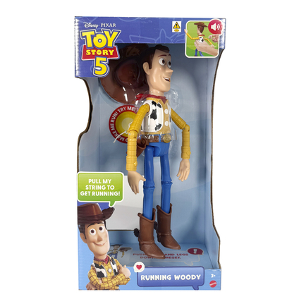 See Woody run! Hold Woody's torso and pull the string on his back to see his fun frantic running motion! Arms flail and legs pump, accompanied by more than 50 phrases and sounds from the movie.