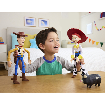 Large scale! Woody stands 12.25 inches tall. He's designed at 12-inch scale, a larger size that's easy to handle. "At scale" means he's accurate in size to other figures as they appear on screen.