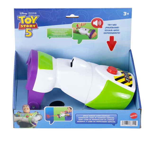 Star Command, come in, Star Command! With the Space Ranger Laser Gauntlet, the fun of Toy Story 5 and Buzz Lightyear’s space adventures comes home. Press the button on the top of the gauntlet to activate laser shots, then hold down for a perfectly timed explosion – projected onto surface with sounds and vibrations to simulate the galactic attack! With 35+ sounds, it is equipped for all Space Rangers to take off on their own epic adventures. Perfect for Toy Story 5 fans of all ages 3 and up. Colors and decorations may vary.