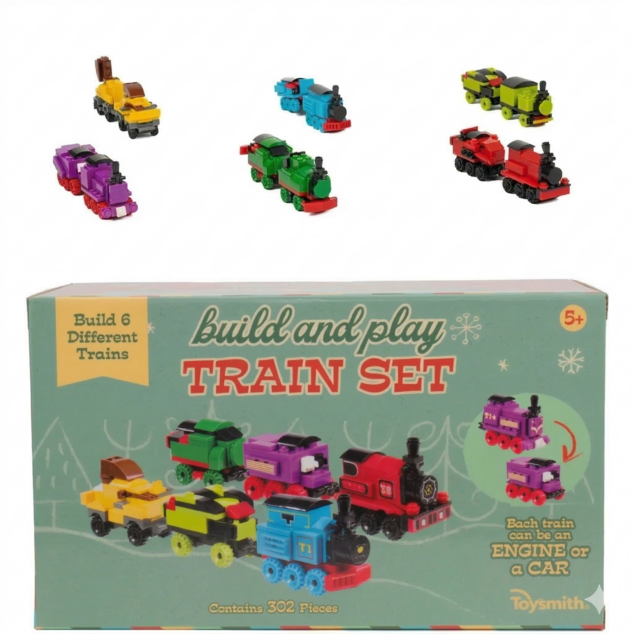 Become a conductor with Toysmith’s 6-Piece Building Blocks Train Set. Includes plastic building blocks of varying sizes and colors with instructions to create six unique pieces of the train set. The building blocks to complete each train set piece are individually packaged. Grab six people, hand a pack of building blocks to each, and race to see who can build their train piece the fastest. Once complete, the train pieces can be played with like any train toy, complete with wheels that really turn.