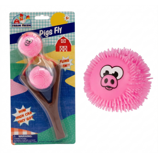 Each peggable packet includes 1 brown plastic 7-inch slingshot with a connected orange rubber band, and 2 pig-themed pink 2-inch squish balls. The tiny pig-inspired launch balls are made with soft, nontoxic plastic. Each one is light pink and features a cartoon pig face with wide eyes and a snout. Balls also feature textured bodies with small nubs for enjoyable tactile sensations.