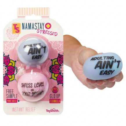 A Toysmith twist on the ubiquitous stress ball, the Namastay Stressed 2-pack stress ball set is a popular self-care item. Each peggable packet includes 2 super squishy stress balls with funny phrases only Millennials will understand. Balls are light pink and light purple with black font. Made for a soothing experience, these stress balls feature a smooth exterior, are small enough to hold in 1 hand, and are gel-filled for easy squeezing.