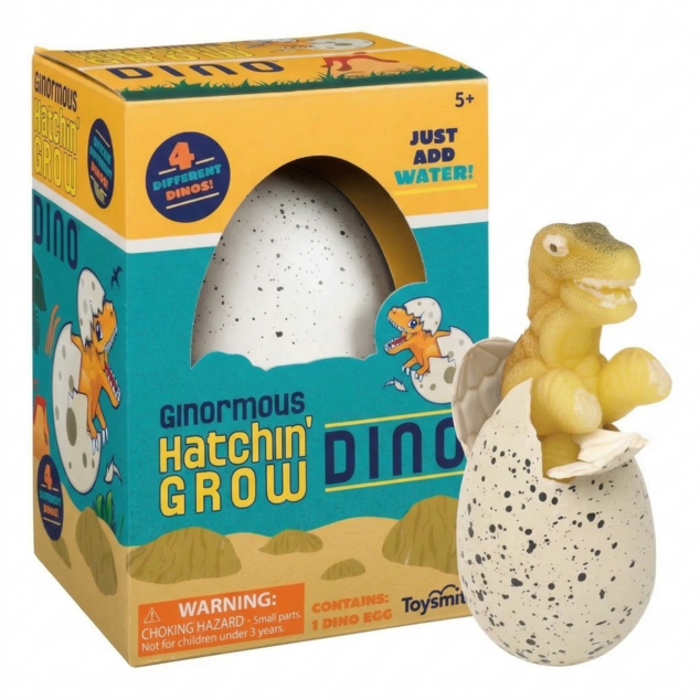 From Toysmith’s Hatchin’ Grow collection comes the popular Ginormous Hatchin’ Grow Dino Egg. Each 4.5-inch speckled egg comes in its own colorful box and dissolves in water to reveal 1 of 4 assorted dinosaurs inside. Submerge egg in water for 48: 72 hours to dissolve. Assorted dinosaurs include a T. rex, parasaurolophus, triceratops, and stegosaurus. Pack quantity includes 8 individually boxed dino egg water-grow toys.