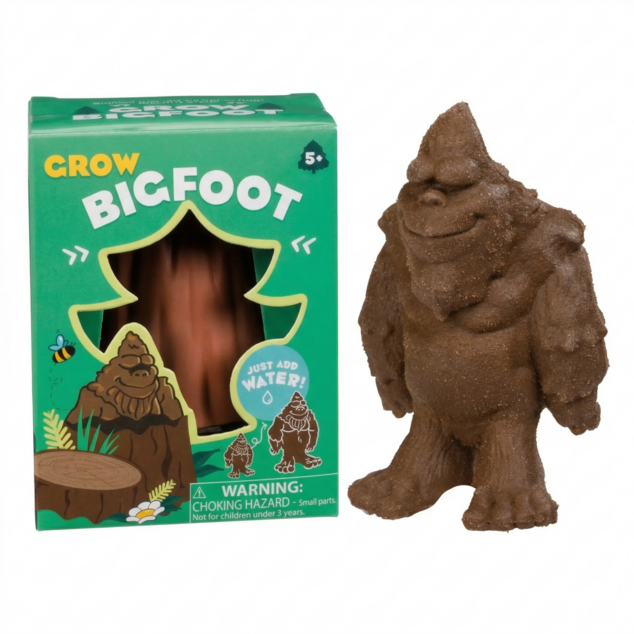 This popular water-grow Bigfoot toy is a fun way to bring a mythical creature to life and inspire pretend play. Each forest-themed package contains 1 brown tree stump with a water-grow Bigfoot inside. Keep the stump in water for 48-72 hours. Once Bigfoot emerges, remove the stump, and replace the water in the container. Allow Bigfoot to stay in the water for 3-10 days, and he’ll continue to grow. At full growth, Bigfoot should be about 6-7 inches tall. A forest-themed 7.09-inch x 8.66-inch display case holds 12 Grow Bigfoot boxes.
