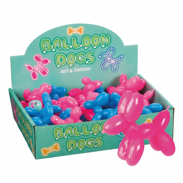 3" L x 2" H squeezable, stretchy balloon dogs. Assorted colors. Age: 3yr+ Case: 24